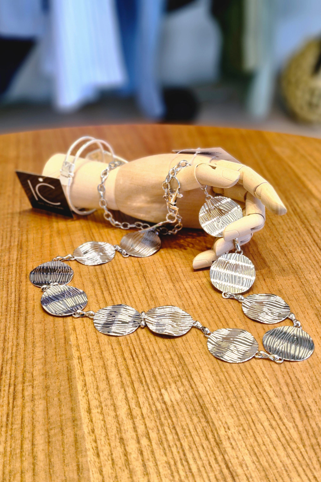Cinto de corrente metalizada em formato redondo e textura rajada. Disponível no prata e no dourado. Tamanho único, veste do PP ao GG.